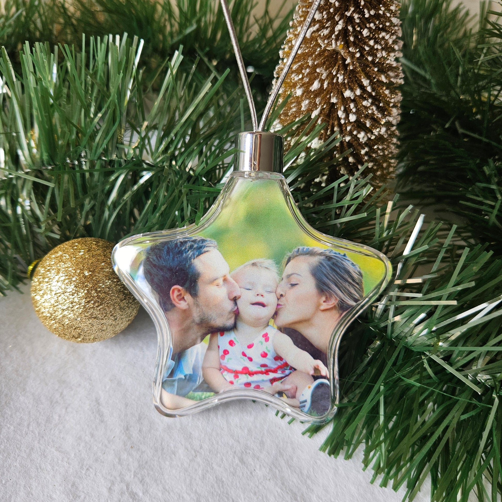 Boule de Noël personnalisée avec photos recto verso, forme étoile.