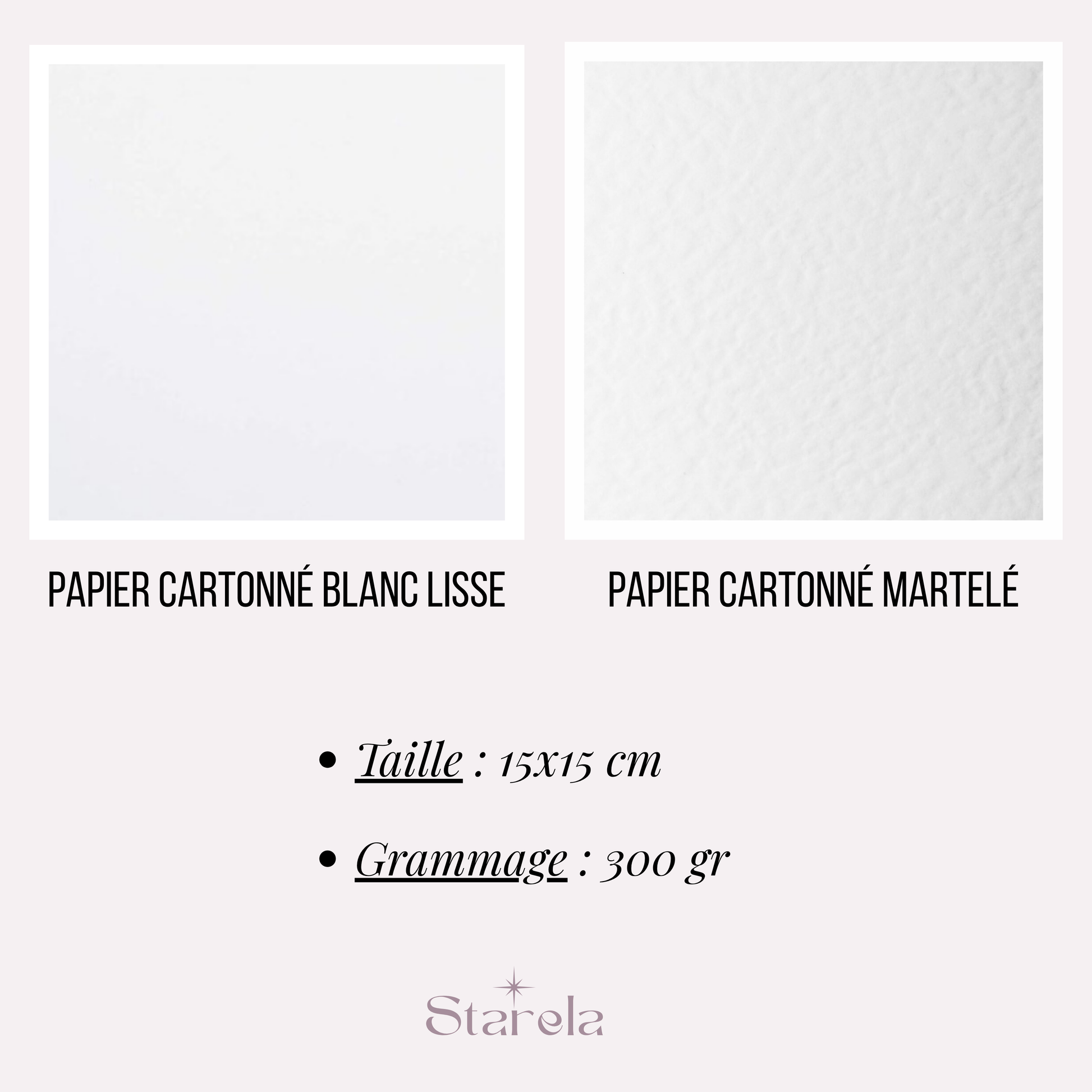 - Papier : carton de qualité supérieure lisse ou martelé (au choix)